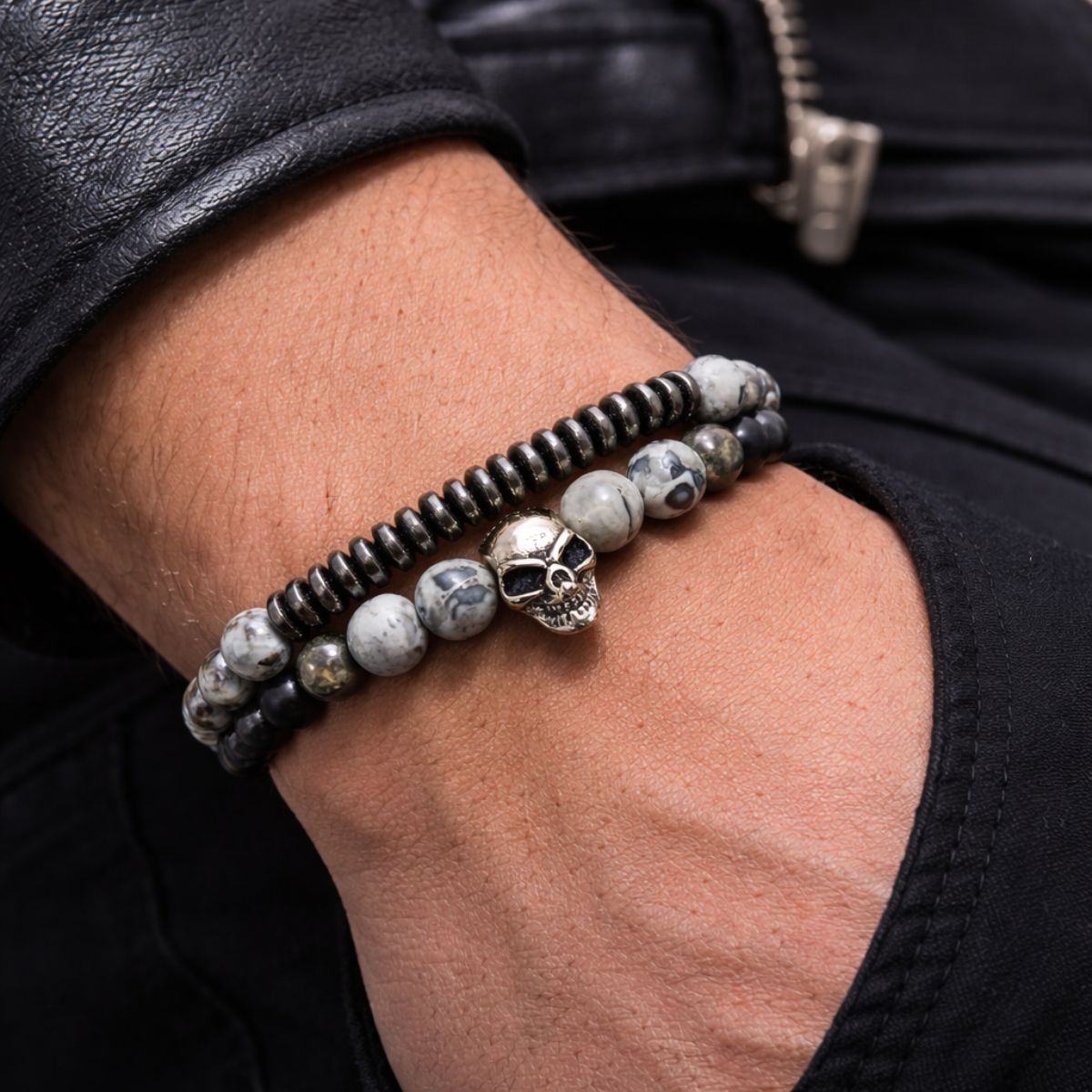 Palavras-chave: pulseiras masculinas, kit pulseiras, pedra natural, ônix fosco, hematita, jaspe cinza, pulseira caveira, estilo rock, estilo punk, acessório masculino, pulseira ajustável, pulseira masculina kit 2, pulseira skull, pulseira alternativa, moda masculina urbana